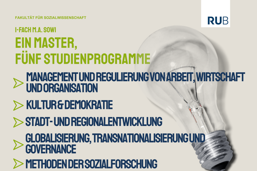 Der 1-Fach Master Sozialwissenschaft richtet sich an Absolvent:innen sozialwissenschaftlich ausgerichteter Bachelor-Studiengänge und vertieft die Auseinandersetzung mit komplexen gesellschaftlichen Problemen aus interdisziplinärer Perspektive. Studierende haben die Wahl zwischen fünf verschiedenen Studienprogrammen, die zentrale Zukunftsfragen unserer Gesellschaft behandeln und dem Studium einen thematischen Fokus geben. Neben der Programmauswahl wird die individuelle Profilbildung durch das breite Angebot ergänzender Module sowie einen integrierten Forschungs- und Praxisbezug gefördert